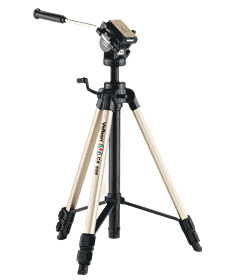 2-way oil-fluid panhead with quick-release platform, geared elevator, bubble leveller, radial braces, 3-section legs with rubber feet. Titanium color finish on legs.